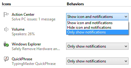 - On Notification Area Icons window, choose the behaviors of icons for specific icons based on whether you want to show or hide icons or notifications on the taskbar.